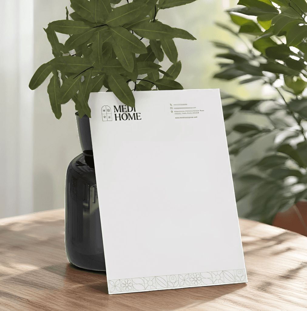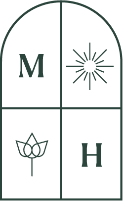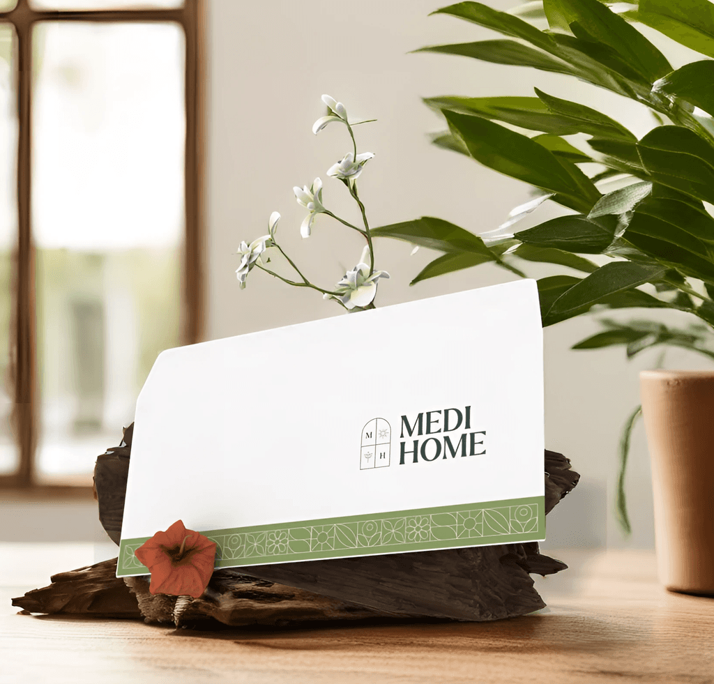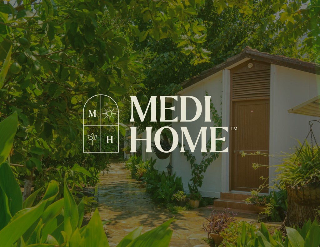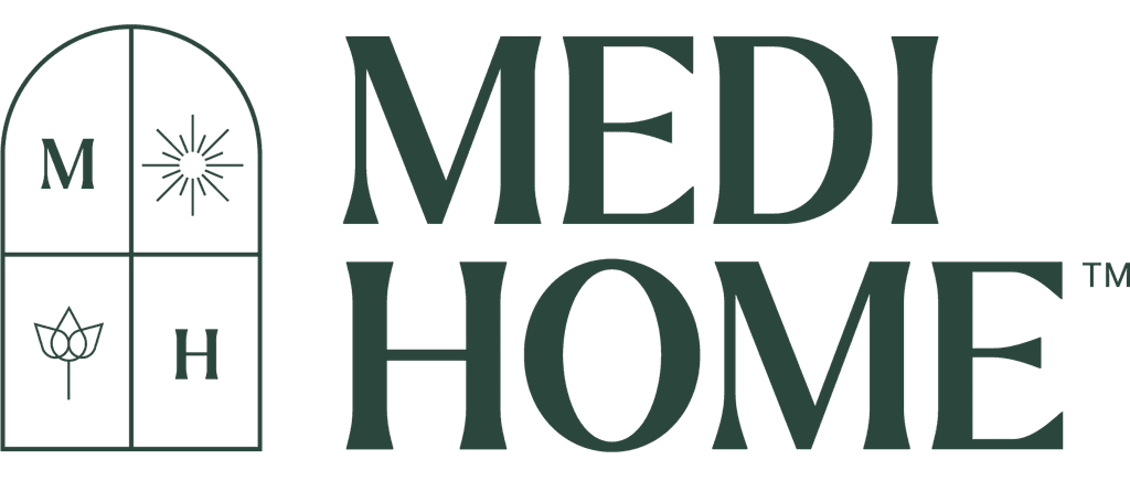 The Medi Home emblem features a window, symbolizing an open and comforting space. The initials 'M' and 'H' are diagonally positioned, representing the brand name, while the sun and flower motifs in the remaining panes convey healing, warmth, and a connection to nature.